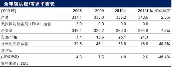 盡管2011年全球經(jīng)濟(jì)充滿著各種不確定性,尤其是中國的通貨膨脹和不斷進(jìn)行的各種緊縮政策令市場擔(dān)憂,但是在整個經(jīng)濟(jì)基本面不遭到大破壞的前提下,即便是將錫的消費(fèi)量調(diào)整到一個微幅增長的狀態(tài),2011年全球市場仍可能會有2萬噸左右的供應(yīng)短缺,而且?guī)齑嫦M(fèi)周比預(yù)計會降至2.6周的低點(diǎn)。