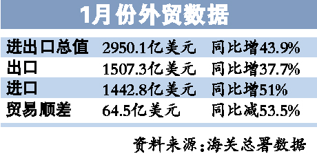 據(jù)新華社電 海關(guān)總署14日發(fā)布的數(shù)據(jù)顯示,1月份我國對外貿(mào)易進出口總值為2950.1億美元,比去年同期增長43.9%。貿(mào)易順差達64.5億美元,減少 53.5%。海關(guān)數(shù)據(jù)顯示,1月我國外貿(mào)出口1507.3億美元,增長37.7%;進口1442.8億美元,增長51%。