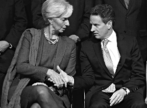 2月19日,美國財長蓋特納(右)與法國財長拉加德溝通。拉加德對媒體稱,(與會各方)協(xié)商氣氛坦承、有時有些緊張。 |