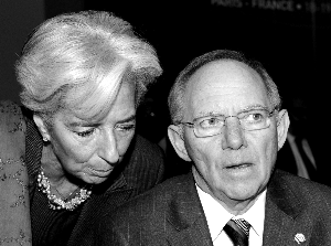 19日,德國財長朔伊布勒(右)與法國財長拉加德交流。 |