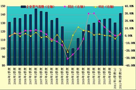 自2006年以來,第一季度的企業(yè)景氣指數(shù)會比前一年度第四季度環(huán)比明顯下降,除2008-2009年經(jīng)濟(jì)危機(jī)的特例,所以預(yù)估1-3月的企業(yè) 景氣指數(shù)環(huán)比仍會下降,反應(yīng)季節(jié)性波動,企業(yè)備貨時觀望氣候濃厚,隨著第二季度生產(chǎn)旺季的到來,景氣指數(shù)會明顯上升。預(yù)測企業(yè)景氣指數(shù)同比增長3%左右, 說明我國的企業(yè)總體成長的趨勢沒有改變。