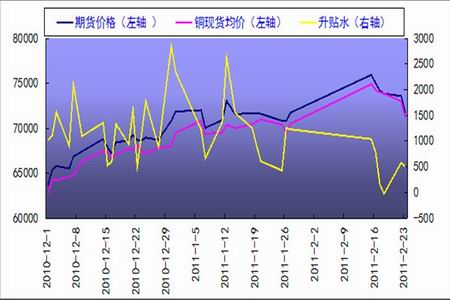 從上年12月滬銅的期貨對現(xiàn)貨的升貼水的趨勢圖可見,2月份的升貼水明顯降低,表明后期市場對期貨的價格預(yù)期不如前期樂觀。后期的現(xiàn)貨市場的交 易情況直接關(guān)系著庫存的消耗和市場對后市的信心,預(yù)計(jì)3月份因高企銅價導(dǎo)致下游觀望氣候濃,小規(guī)模隨時采購的策略,庫存一時難以消化,市場的成交量開始放 大,但是可能不如預(yù)期的樂觀,導(dǎo)致升貼水進(jìn)一步走低。
