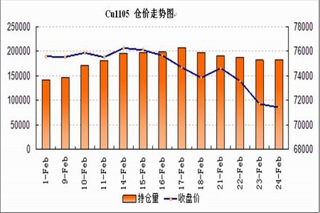 2月份以來Cu主力合約1105的持倉量節(jié)后穩(wěn)定增長,從不足10萬手增長到近20萬手,隨著價格的震蕩下行,成交量一直維持在近20萬手的水平,市場參與度高。