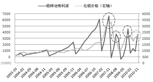 但是2010年“血鉛”事件和“十一五減排”任務(wù),使得2009年因汽車產(chǎn)業(yè)快速發(fā)展而不斷擴(kuò)張的電解鉛產(chǎn)量開始連續(xù) 下滑。上游鉛精礦因擴(kuò)大產(chǎn)量及進(jìn)口的增加,鉛精礦價(jià)格的漲幅相對較小,而一些小鉛冶煉廠的停產(chǎn)使得國內(nèi)電解鉛供給縮減,再加上通脹背景下鉛價(jià)的上漲,這使 得其他大中型冶煉廠的利潤明顯提高,并逼近利潤高位區(qū)間,使得鉛價(jià)存在下跌風(fēng)險(xiǎn),因?yàn)樵?/SPAN>2007、2008、2009年當(dāng)鉛冶煉利潤達(dá)到高位區(qū)間時(shí),都出 現(xiàn)過鉛價(jià)不同程度的回調(diào)。