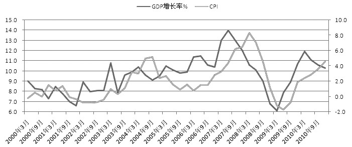 那么,通脹何時(shí)結(jié)束,國內(nèi)CPI何時(shí)見頂?我們分析發(fā)現(xiàn),GDP增長率往往會較CPI先反應(yīng),特別是2007年6月GDP增長率見頂后,2008年3月 份CPI見頂。去年3月份GDP結(jié)束了連續(xù)創(chuàng)新高的局面,如果3月份是“頂”的話,那么意味著CPI極有可能在今年見頂,根據(jù)我們的分析,CPI可能在今 年二季度末見頂。
