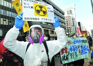 東京電力公司宣布,27日上午宣布的福島第一核電站2號機組渦輪機房地下室積水放射性物質(zhì)活度超標1000萬倍的數(shù)值嚴重有誤,重新分析后發(fā)現(xiàn),其放射性活度超標10萬倍左右,而非此前宣布的1000萬倍。圖為示威者27日在東電總部大樓前抗議。