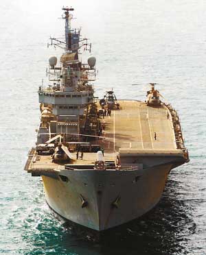 皇家方舟號(hào) 1978年12月開工并于1985年11月加入現(xiàn)役 航母全長206.6米,寬27.7米,標(biāo)準(zhǔn)排水量16000噸 配置:載機(jī)為8架“海鷂”式垂直起降戰(zhàn)斗機(jī)和12架“海王”直升機(jī)。 |