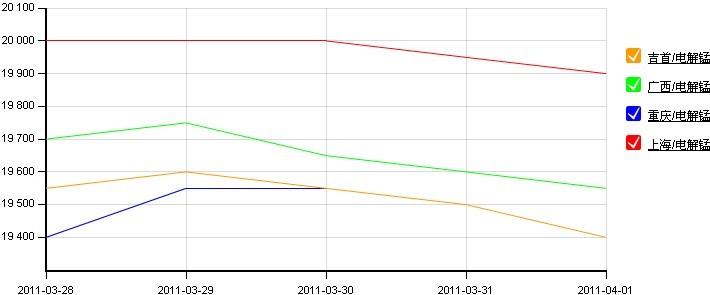 圖1:全國主要地區(qū)電解錳價(jià)格走勢圖(2011.3.28-2011.4.1)