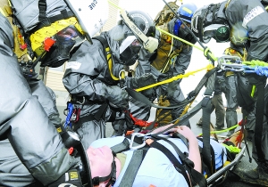 當(dāng)?shù)貢r(shí)間4月9日,日本東京橫田基地,為應(yīng)對(duì)福島第一核電站事故而派至日本的美國(guó)海軍陸戰(zhàn)隊(duì)防核部隊(duì)在進(jìn)行模擬訓(xùn)練。 東方IC供圖