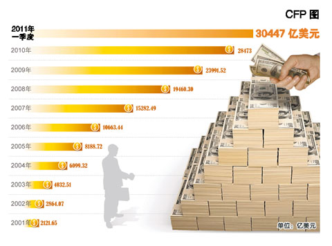 昨日,央行公布的數(shù)據(jù)顯示,我國外匯儲備首次超3萬億美元。截至3月末,國家外匯儲備余額為30447億美元,同比增長24.4%。 外匯儲備是指一國政府所持有的國際儲備資產(chǎn)中的外匯部分,即一國政府保有的以外幣表示的債權(quán)。 數(shù)據(jù)顯示,2011年第一季度國家外匯儲備增加了1974億美元,與2010年第四季度1990億美元的增加額相比變化不大。單月看,1月份增加844億美元,2月份增加了597億美元,3月份增加了533億美元。 數(shù)據(jù)顯示,中國黃金儲備持有量依舊為3389萬盎司。