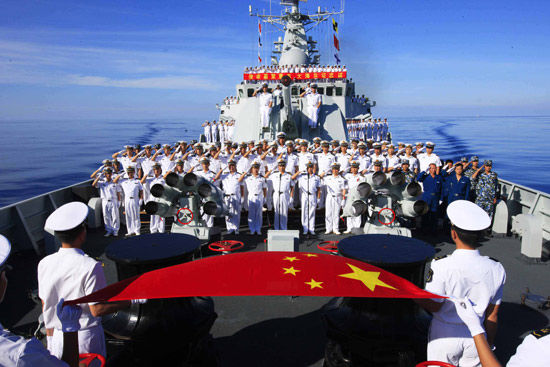 資料圖:中國海軍戰(zhàn)艦上軍人列隊向國旗敬禮