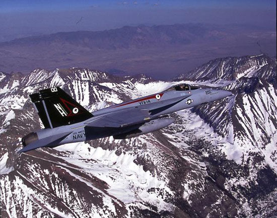 資料圖:美軍F-18戰(zhàn)機(jī)在寒冷山地上空飛行