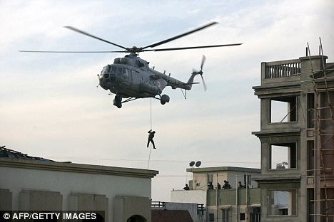 印度突擊隊用直升飛機放下滑索抓捕恐怖分子。
