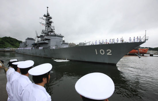 資料圖:2009年7月6日,在日本神奈川縣的海上自衛(wèi)隊(duì)橫須賀基地,自衛(wèi)隊(duì)士兵列隊(duì)目送“春雨”號(hào)驅(qū)逐艦出港赴索馬里執(zhí)行打擊海盜任務(wù)。