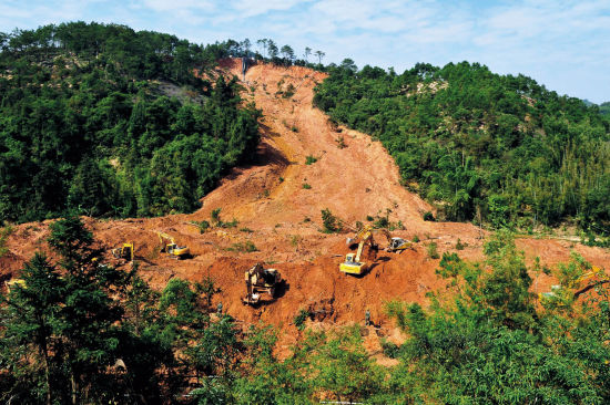 本刊記者到達(dá)現(xiàn)場時(shí),雖然所有遇難人員都已找到,但整個(gè)滑坡區(qū)域還被控制在警戒線內(nèi)。“險(xiǎn)情還沒有完全排除,地質(zhì)結(jié)構(gòu)很不穩(wěn)定,隨時(shí)有再發(fā)生滑坡的可能!敝凳氐拿窬f。根據(jù)梧州市地址環(huán)境檢測站提供的信息,蒼梧縣屬于典型的丘陵地貌,巖體主要是花崗巖,上面覆蓋2~3厘米的殘破積層,巖性為粉質(zhì)黏土,結(jié)構(gòu)松散。一般對于花崗巖巖性的地區(qū)而言,大于1萬立方米的山體滑坡就是比較大型的滑坡,6.8萬立方米實(shí)屬少見。梧州市國土資源局的相關(guān)負(fù)責(zé)人劉彥告訴本刊記者:“梧州是地質(zhì)災(zāi)害的高發(fā)地區(qū),夏季經(jīng)常會(huì)因?yàn)楸┯暌l(fā)滑坡,去年夏天蒼梧縣的沙頭鎮(zhèn)就曾因?yàn)榛略斐墒畮兹耸й!彪m然最終的調(diào)查結(jié)果還沒有公布,但地質(zhì)監(jiān)測的專家們已經(jīng)基本可以確定,造成滑坡的原因正是由于在事發(fā)山地私采稀土。