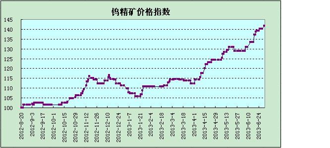 7月8日鎢精礦價格為144500元/噸,價格指數(shù)為141.67(2012-8-20,102000元/噸),較周期內(nèi)最低點 100(2012-8-20)上調(diào)了41.67。由于上周五最新公布的五礦指導價格并沒有上漲,與6月持平,為15.5萬元/噸,加上之前價格持續(xù)上漲很大一部分原因是五礦持續(xù)收儲支撐著,7月指導價不在上調(diào),市場商家對五礦后期會不會持續(xù)采購質(zhì)疑,認為鎢礦價格已經(jīng)到底了,因此今日市場鎢礦行情有看弱趨勢,但主流價格幾乎沒變。