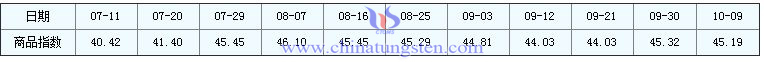 2016年10月9日鎢精礦商品指數(shù)為45.19,較昨日下降了0.13點,較周期內(nèi)最高點100.00點(2011-09-12)下降了54.81%,較2015年11月24日最低點33.12點上漲了36.44%。(注:周期指2011-09-01至今)