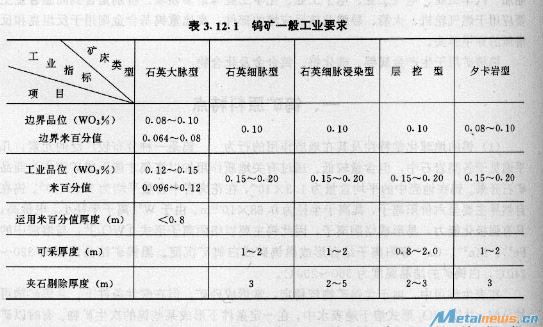 表3.12.1鎢礦一般工業(yè)要求