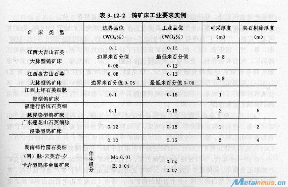 表3.12.2鎢礦床工業(yè)要求實(shí)例