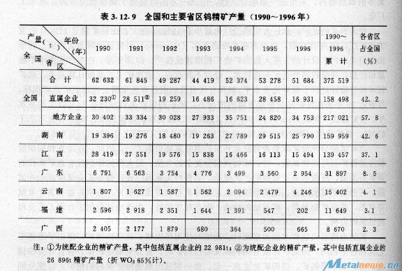 表3.12.9全國和主要省區(qū)鎢精礦產(chǎn)量(1990~1996年)