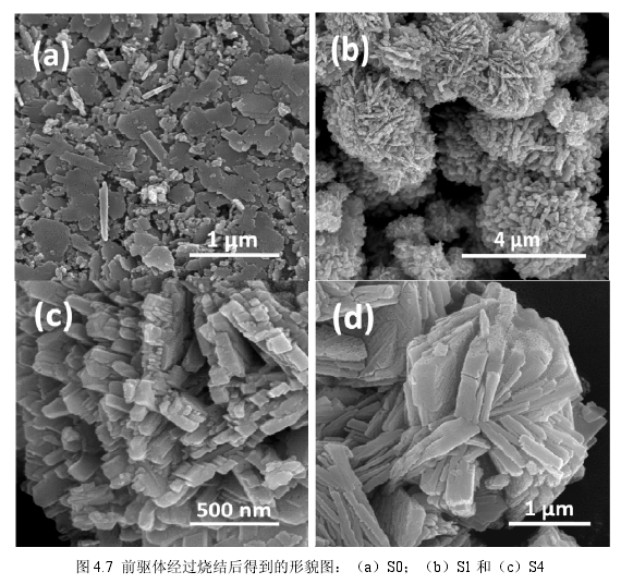 據(jù)報(bào)道,在室溫下W03·H20會(huì)對(duì)易燃有機(jī)氣體和有害氣體表現(xiàn)出一定的響應(yīng)。本實(shí)驗(yàn)中制得的W03·0.33H20和W03·H20同樣也可能會(huì)對(duì)酒精表現(xiàn)出一定的靈敏度,但是結(jié)合實(shí)際考慮,要使氣敏原件能在不同環(huán)境不同溫度下正常工作,氣敏元件必須要有足夠的穩(wěn)定性。因此,我們?cè)?00℃的溫度下對(duì)前驅(qū)體進(jìn)行了2.5小時(shí)的熱處理以便除去三氧化鎢水合物中的結(jié)晶水分子。同時(shí),為了方便描述,我們分別將MA/W=0,1,4制備的前驅(qū)體然后再經(jīng)過(guò)燒結(jié)的最終產(chǎn)物標(biāo)識(shí)為S0, S1, S4。燒結(jié)后所得的三個(gè)樣品S0, S1和S4的形貌如圖4.7所示。從圖4.7(a)我們可以看到,樣品SO與前驅(qū)體相比,不規(guī)則的納米片的棱邊有一定程度的卷曲,散落在其中細(xì)小的納米顆粒有團(tuán)聚的趨勢(shì)。4.7(b)和(c)為樣品S1不同放大倍數(shù)下的掃描圖片,樣品S1中球狀物的大小沒(méi)有發(fā)生明顯變化,與前驅(qū)體相似,中間同樣夾著少量不規(guī)則團(tuán)聚物。從4.7(c)進(jìn)一步觀察樣品S1,我們發(fā)現(xiàn)一些構(gòu)成球狀物的納米塊之間的結(jié)合度變差,在某些納米塊之間出現(xiàn)了縫隙和孔洞,這種多空結(jié)構(gòu)對(duì)樣品的氣敏性能有著非常積極的影響。樣品S4的形貌如圖4.7 (d)所示,厚厚的大塊狀之間依舊結(jié)合緊密,很難區(qū)分出一個(gè)個(gè)單體球狀結(jié)構(gòu)。但S4與前驅(qū)體的形貌不同之處在于這些結(jié)合緊密的塊狀物的表面變得粗糙,同時(shí)還發(fā)現(xiàn)少量的裂紋出現(xiàn)在其粗糙的表面。結(jié)合以上觀察從理論分析可以得出,隨后的熱處理對(duì)前驅(qū)體的形貌有一定程度的影響,熱處理在一定程度上對(duì)樣品SO的性能有著消極影響,而對(duì)S1和S4的比表面積的增加有重要貢獻(xiàn)。
