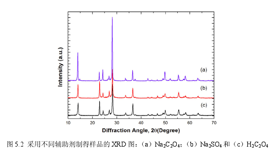對(duì)制取的一維納米WO3抽取3格樣品進(jìn)行XRD分析。圖5.2為樣品A, B和C的X射線衍射圖譜。從圖5.2可以看到,三個(gè)樣品的各個(gè)衍射峰都很強(qiáng)且較為尖銳,表明三個(gè)樣品的結(jié)晶度都很高。其中以Na2C204作為輔助劑得到WO3的衍射峰最為尖銳。經(jīng)過(guò)分析,我們發(fā)現(xiàn)三個(gè)樣品都與六方晶系WO3的標(biāo)準(zhǔn)卡片(JCPDS N0.75-2187)完全對(duì)應(yīng),無(wú)其它雜峰出現(xiàn),表明制備出的WO3純凈無(wú)雜物。由此表明,我們采用的三種不同種類(lèi)的輔助劑在當(dāng)前水熱條件(180℃保溫24h)下成功地制備出了純度和結(jié)晶度都很高的WO3。