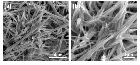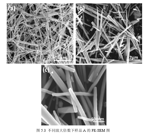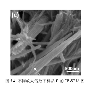 通過SEM電子圖來觀察一維納米WO3的的形態(tài),從圖5.3我們可以看到,WO3樣品A整體呈稍顯扁平的納米棒狀結(jié)構(gòu),納米棒排列雜亂無章。仔細觀察發(fā)現(xiàn),棒狀結(jié)構(gòu)是有許多直徑約為15~30nm細小的納米線平行排列而成。整體的納米棒呈類似針狀,一端較小,另一端較大,較小一端直徑約為100nm,較大一端直徑約為200nm,納米棒的長度在3~5um之間。圖5.4為樣品B的形貌特征,其主要是由雜亂無序的納米帶和粘連纏繞在其表面的非常細小的納米線組成。納米帶的寬度為100-300nm,長度可達1Oum,其中的納米線長短不一,較為嚴(yán)重地粘連在納米帶表面,無法判斷其橫截面的大小?梢园l(fā)現(xiàn),樣品B的帶狀結(jié)構(gòu)也是由許多相互平行排列的直徑約為35nm的納米線組成。樣品C的形貌特征展示在圖5.5中,從圖中我們可以看到,樣品C整體由雜亂無序且團聚較為嚴(yán)重的納米短棒構(gòu)成。同樣我們也可以發(fā)現(xiàn)棒狀結(jié)構(gòu)也是由許多納米線平行排列組成。納米棒呈扁平狀,呈完全無序狀態(tài),其長短不一,較長的有2um,而較短只有不到500nm,其粗細也非常不均勻,較大的直徑約為200nm,較小的直徑約為100nm。 從圖我們可以得到以下結(jié)論:①無論是棒狀還是帶狀結(jié)構(gòu),都是由細小的納米線平行排列組裝而成,這與文獻觀察到的實驗結(jié)果相吻合;②三個樣品的整體形貌存在很大差異,除了所采用的輔助劑有明顯不同外,其他制備過程完全相同。因此,我們斷定Na2C204, Na2S04和H2C204是造成本實驗中一維米WO3形貌具有較大差異的主要原因,Na十、C2O4 2- . SO4 2-在WO3的制備過程中起著不同的作用和影響。同時,在此反應(yīng)條件下,三個樣品的結(jié)晶相均為六方相,表明輔助劑并未對其結(jié)晶相造成影響。