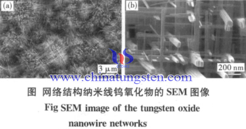 Zhou等以鎢粉為原料在氧氣氣氛下用過熱蒸發(fā)的方法合成1出由寬度為10-180nm的多邊形納米線交叉構(gòu)建成如圖的三維網(wǎng)絡(luò)結(jié)構(gòu)的鎢氧化物。這種結(jié)構(gòu)與Hu等得到的樹形結(jié)構(gòu)不同,結(jié)構(gòu)中沒有明顯的莖干存在。LI等通過在空氣中用紅外線照射的方法加熱鎢燈絲至950-1000℃,制備出一維納米結(jié)構(gòu)的WO3材料。這種合成方法簡單易行,容易實現(xiàn)規(guī)模化生產(chǎn)。之后,他們又采用類似的方法,在不同的真空條件下通過紅外線照射鎢箔制備出W18O49納米管和納米線。納米管和納米線的直徑分別為150-350nm和20-100nm而且都是W18O49單晶。他們認(rèn)為大氣壓力在兩種不同形態(tài)的一維鎢氧化物結(jié)晶成核過程中起著重要作用。 Hong等報道了一種簡單的大規(guī)模制備鎢氧化物納米帶的方法。該方法是將經(jīng)超聲清洗過的面積小于1cm2的金屬鎢板作襯底。以沉積在鎢板上的碘化鉀作催化劑,在一定的濕度條件下氧化金屬鎢板,制備出的納米帶厚度為40-100nm,最大寬度和最大長度分別為1um、幾百微米。該合成方法簡單易行,適合規(guī);a(chǎn)納米帶。