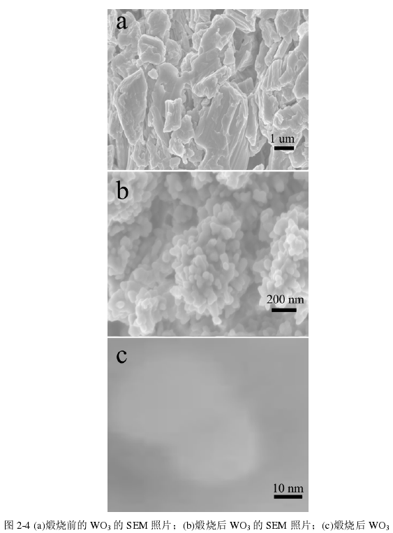 以鎢酸鈉、氨水、聚乙烯醇等作為原料,按照一定的配比,超聲乳化,加入濃鹽酸得到黃鎢酸沉淀,在400、600和800攝氏度下恒溫八小時(shí)得到的WO3平均粒徑分別為15、25、85nm,WO3粉體均分散性較好,顆粒呈現(xiàn)規(guī)則的球狀結(jié)構(gòu),粒徑隨處理溫度的提高而長(zhǎng)大。