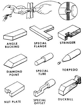 Bucking bars are tools used to form bucktails (the head formed during riveting operations) on rivets. They come in many different shapes and sizes, as shown in figure 13-4. Bucking bars are normally made from an alloy steel similar to tool steel. The particular shape to be used depends upon the location and accessibility of the rivet to be driven. The size