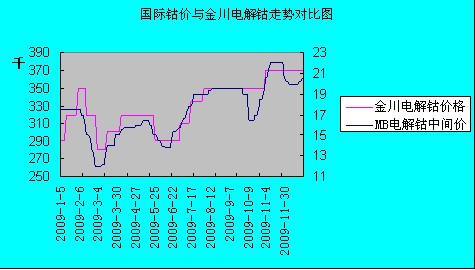 一、2009年中國鈷市行情回顧與分析 1.1國際市場鈷價走勢分析 2009年一季度,由于08年下半年全球金融危機爆發(fā)的延續(xù),電池行業(yè)、硬質(zhì)合金業(yè)需求極度疲軟。國際市場金屬鈷價經(jīng)歷了下跌又反彈的過程:高品位 99.8%鈷價從一月初的16-19美元/磅跌至二月底三月初11-13美元/磅,低品位99.3%鈷價由10.5-15.5美元/磅跌至二月底的9.9 -12美元/磅。由于國內(nèi)外價差擴大,從國際市場進口低價金屬鈷有價格優(yōu)勢,引發(fā)了中國商家的收購熱情,帶領(lǐng)國際鈷價走出低谷。3月底高品位和低品位鈷價 分別回升至14-16美元/磅和11.5-14.5美元/磅。 第二季度,傳言中國國儲局欲購買鈷金屬。國際市場庫存消耗殆盡,非洲供應(yīng)縮減。投機者趁機進入市場。4月份延續(xù)3月的上升勢頭,并在五月初達到又一個 頂峰,高品位16-17美元/磅,低品位15-16美元/磅;然而由于國際市場鈷的真正消費需求并沒有全面恢復(fù),在投機商的參與下,貿(mào)易商和生產(chǎn)商為了降低風險急于大舉拋貨,鈷價進入下滑通道,6月11日高品位跌至13.5-14美元/磅,低品位鈷至12.15-13.5美元/磅。然后開始新一輪拉升回 調(diào)。 由于西方夏休因素,七八月份通常是鈷市需求的淡季。但是供應(yīng)面的緊張讓鈷價一直保持堅挺。包括Chambishi在內(nèi)的很多公司的停產(chǎn)、金川產(chǎn)品的缺貨、 日本住友產(chǎn)品的售罄和Vale Inco工人的罷工都是影響供應(yīng)面的重要因素。另外,亞洲市場化工品行業(yè)和中國電池行業(yè)需求的復(fù)蘇也造成對碎陰極鈷的需求增多。日韓鈷消費補充庫存,以及 日本計劃收儲130噸鈷的消息,拉動了國際市場需求上漲。08年末由于價格下跌趨勢中,多數(shù)下游企業(yè)未下采購訂單。韓國電池和化工企業(yè)對后期鈷市看好,因 此對鈷的采購量不斷增加,7月份的采購水平已經(jīng)超過08年的峰值;而日本電池企業(yè)復(fù)工率達到90%左右,加上上半年自身庫存不斷消耗,迫切有補貨的要求。 帶動國際鈷市活躍起來。此波拉升至8月13日,高品位鈷價達到18.8-20.2美元/磅低品位鈷價升至17.5-18.5美元/磅。此后國際鈷價進入較 長時間的橫盤狀態(tài)。截止第三季度末稍有調(diào)整,分別為18.5-19.5美元/磅和 15.55-16.8美元/磅。 7月份日韓補貨的行為并不能從根本上改變整個國際市場需求低迷的局面。進入第四季度,隨著該利好的炒作影響漸漸消退,市場沒有迎來新的利好支撐。十一期間,鈷價迅速下挫,高品位鈷價至16-17美元/磅,低品位鈷價14.5-15.6美元/磅。隨后在2010年2月份鈷期貨合約時間表的確定、對中國四 季度鈷國內(nèi)需求轉(zhuǎn)暖的預(yù)期、中國買家國際市場的采購以及俄羅斯超級合金行業(yè)需求以及等因素推動下,鈷價快速攀升,11月9日達到年內(nèi)高點,高品位鈷價 21.5-22.5美元/磅,低品位鈷價至19.5-20.5美元/磅。鈷價全面升至20美元以上。新高之后,在實際需求并無實質(zhì)改善的前提下,受炒作資 金獲利平倉以及基本面不強的影響,鈷價又有所回落。十二月中旬開始國際鈷價略有上揚。 1.2金川電解鈷價格走勢分析
