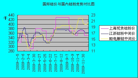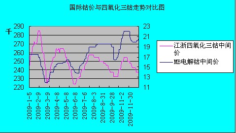 國內(nèi)氧化鈷市場2月份出現(xiàn)26萬甚至超過27萬/噸的年內(nèi)高價,這還是年初下游工廠多數(shù)進行試探性生產(chǎn),電池行業(yè)有力帶動鈷業(yè)的采購下出現(xiàn)的。 隨后全年基本在22萬-26萬/噸的區(qū)間內(nèi)波動,市場價格波動趨勢跟國際鈷價基本保持一致?梢钥闯稣麄2009年國內(nèi)氧化鈷消費需求的慘淡情況。