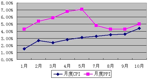 10 月數據公布之前,市場普遍預期,CPI會在4%左右,處于規(guī)避市場動蕩考慮,央行于本周三上調商業(yè)銀行存款準備金25個基點,為年內第四次上調存款準備金 率。但4.4%的CPI數據公布出來之后,還是有點超出市場預期。另外,10月份PPI上漲5.0%,國際大宗商品價格上漲已經逐漸向工業(yè)制成品上轉移。 國內物價上漲已經形成共識,預計后續(xù)央行將采取更多措施打壓通脹預期,年底之前或將再次加息。