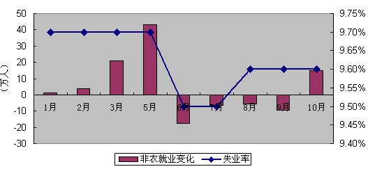 上 周五晚,美國勞工部公布10月份非農就業(yè)數據,10月非農就業(yè)人口意外增加15.1萬人,遠高于預期,其中私營部門就業(yè)人數增加15.9萬人,預期增加 7.5萬人,創(chuàng)下今年4月以來最大月度漲幅。但失業(yè)率為9.6%,與預期持平,為連續(xù)第三個月維持在此高位。單憑此次非農數據趨好斷言就業(yè)市場好轉,為時 尚早。在美聯(lián)儲剛公布6000億美元二次量化的背景之下,數據對市場影響有限,難以從根本上提振美元。