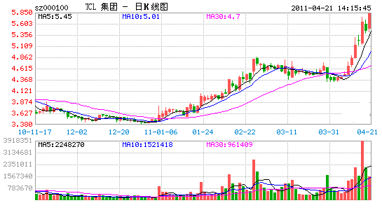 4月1日,TCL集團股份有限公司與烏魯木齊經(jīng)濟技術(shù)開發(fā)區(qū)(頭屯河區(qū))簽訂框架協(xié)議,建設(shè)“TCL新疆產(chǎn)業(yè)園項目”。同時新疆TCL能源有限公司也揭牌成立。此后,TCL股價一路大幅飆漲,至今漲幅超過30%。今日上午TCL再度上漲6.79%,報5.82元。