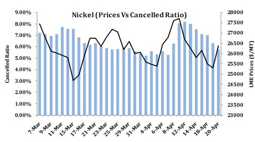 金川集團(tuán)鎳板出廠價(jià)緊隨市場(chǎng)變化,4月19日下調(diào)4000元/噸至193000元/噸。其后,21日,22日,兩次上調(diào)出廠價(jià)4000元/噸至197000元/噸。周內(nèi),市場(chǎng)現(xiàn)貨鎳價(jià)累計(jì)上漲約1000元/噸,市場(chǎng)成交較上周有所好轉(zhuǎn)。