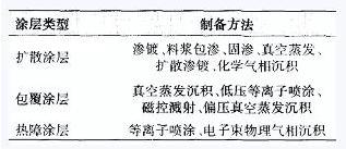 改善材料的耐高溫氧化性僅從材料本身考慮往往是不夠的,實(shí)踐證明,高溫材料本身要做到既有好的高溫強(qiáng)度,又具備優(yōu)良的抗氧化、耐腐蝕性能十分困難,而研制和使用耐高溫涂層,其經(jīng)費(fèi)要比耐高溫材料低得多。近年來(lái),人們研究了各種耐高溫涂層,已經(jīng)得到了很大的發(fā)展,從傳統(tǒng)的鋁化物涂層到熱障涂層,從單層涂層到多層涂層[19]。耐高溫涂層的涂覆方法很多,不同類型的耐高溫涂層有不同的制備方法(見表1)。