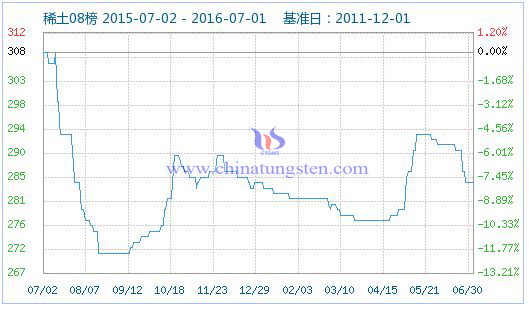 2016年7月1日稀土指數(shù)為283點,較昨日下降了1點,較周期內(nèi)最高點1000點(2011-12-06)下降了71.70%,較2015年09月13日最低點271點上漲了4.43%。(注:周期指2011-12-01至今)