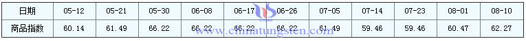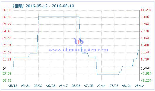 2016年8月10日鉬精礦商品指數(shù)為62.27